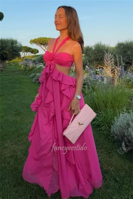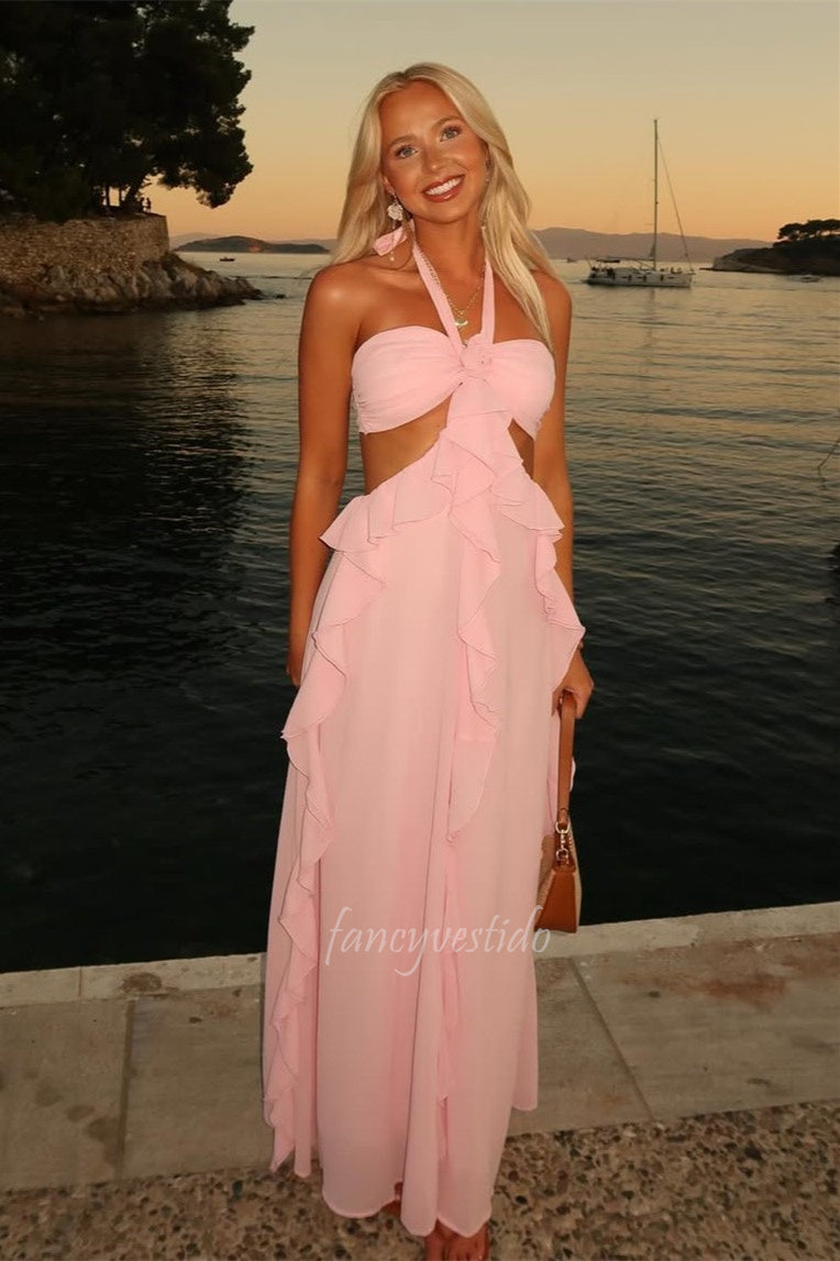 Classy Halter Ruffle Chiffon Prom Maxi Dress with Bow Back
