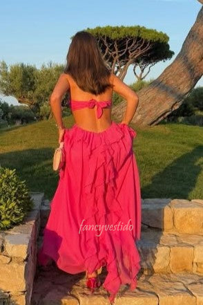 Exude timeless elegance in this refined halter maxi dress crafted from flowing chiffon. The halter neckline creates a striking, shoulder-baring silhouette while delicate ruffles cascade down the skirt, adding graceful movement and visual depth. The standout bow detail at the back provides a sophisticated finishing touch that catches light and draws admiration. Constructed from premium chiffon, this dress offers both comfort and luxury for extended wear. Ideal for those seeking a polished, fashion-conscious look that balances classic sophistication with contemporary flair for any formal occasion.