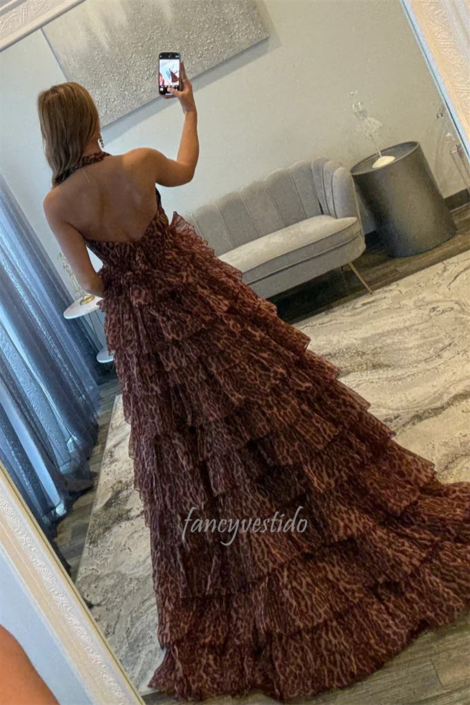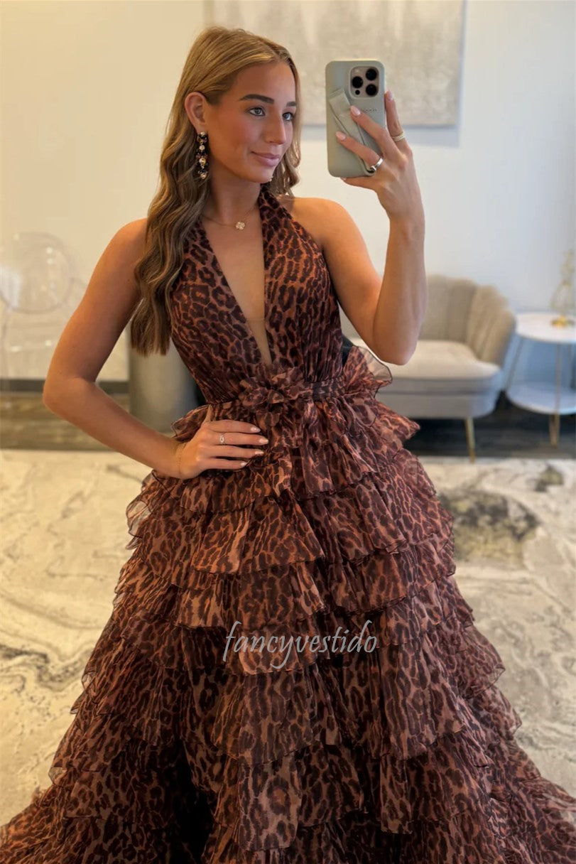 Halter V-Neck Leopard Paint Ruffle A-Line Prom Dress