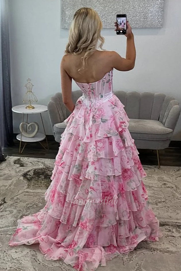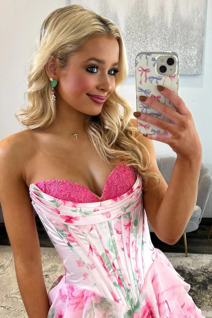 Pink Floral Print Applique Corset A-Line Ruffle Prom Dress
