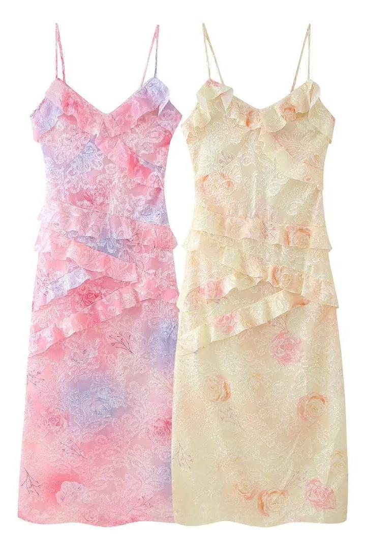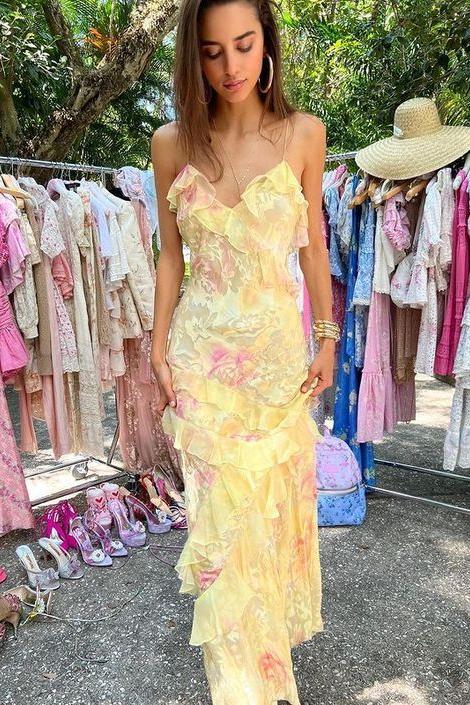 Spaghetti Straps Floral Layered Maxi Dress Party Prom Dress