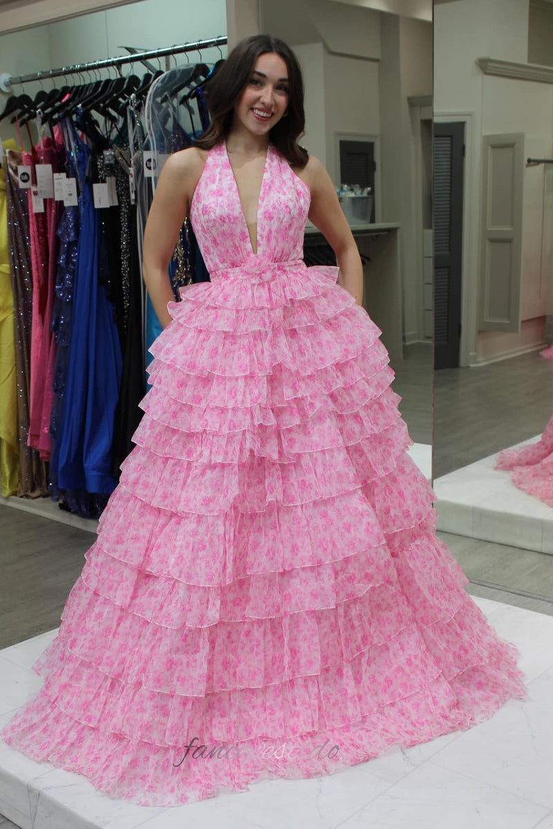 Halter Pink Floral Print Layered A-Line Ruffle Prom Dress