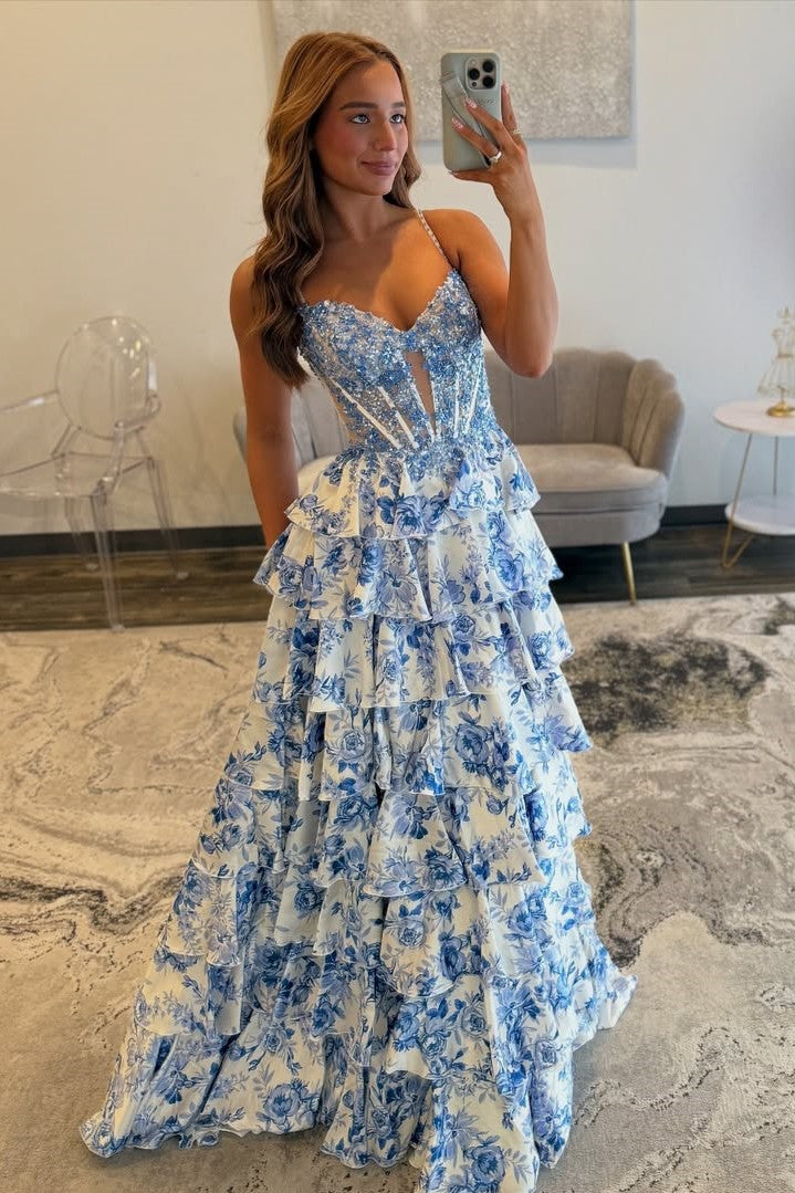 Straps Blue Floral Ruffle Long Prom Dress with Slit