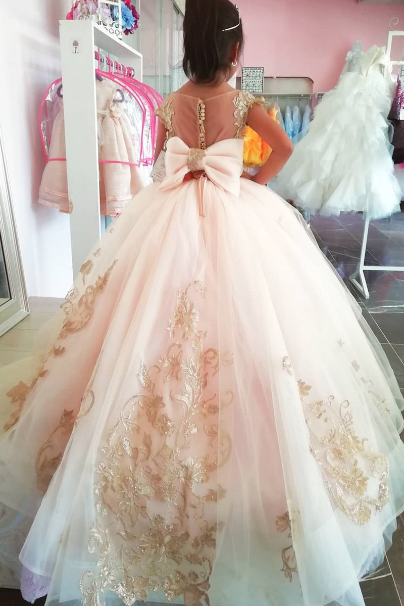 Princess A-line Champagne Flower Girl Dress with Gold Appliques