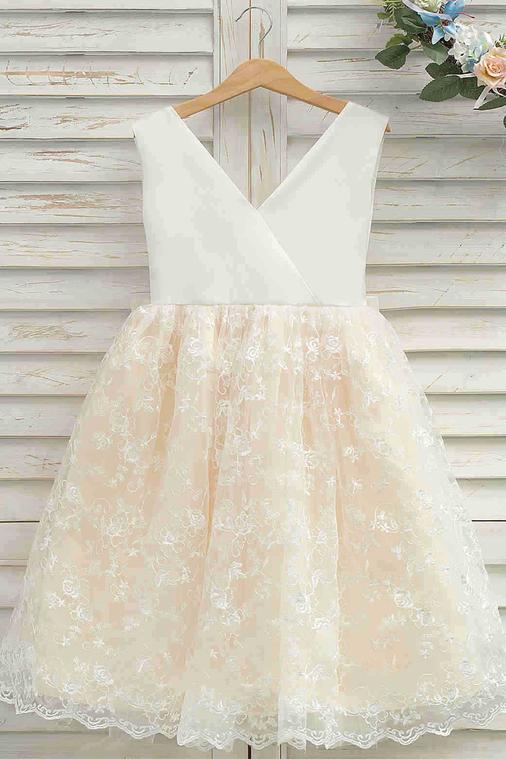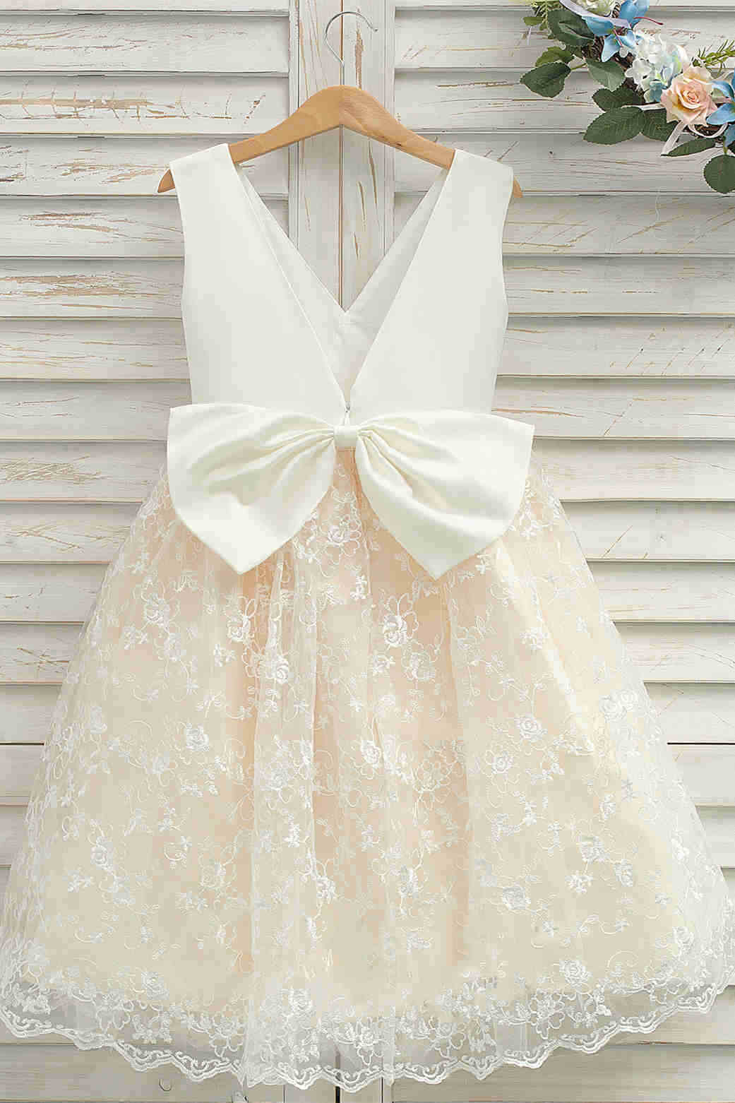 Elegant champagne lace tulle flower girl dress features with v-neck, lace skirt and bow.
