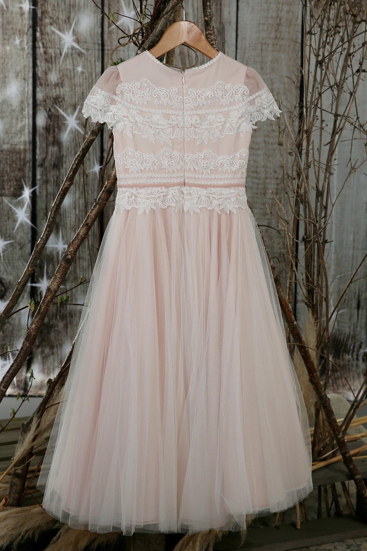 This cute blush pink flower girl dress features a crew neck, lace appliques, belt, and zipper back.