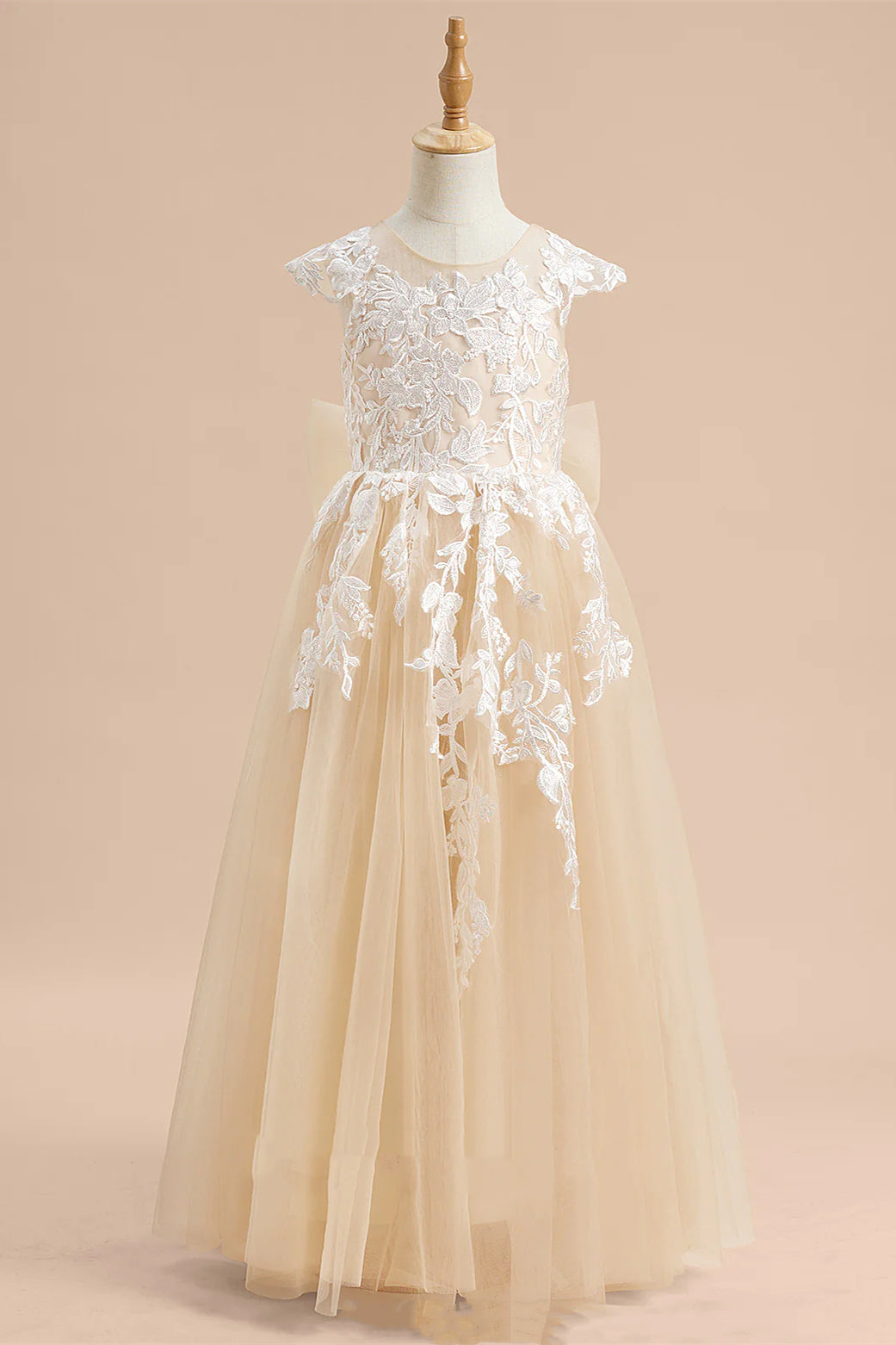 Elegant champagne flower girl dress features with crew neck, lace appliques, and zipper back with pearls.