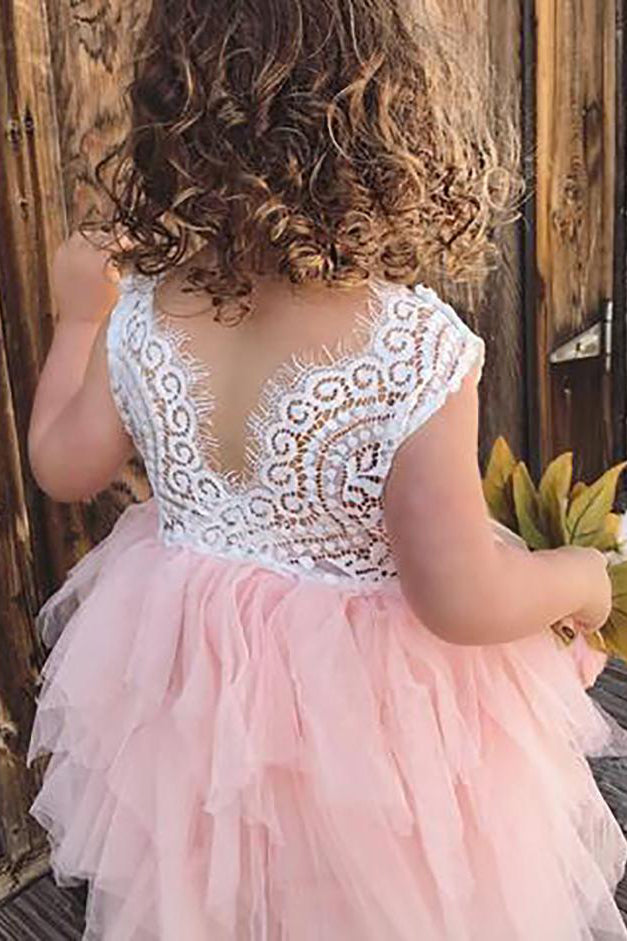 Cute Pink Tiered Flower Girl Dress with Lace Top