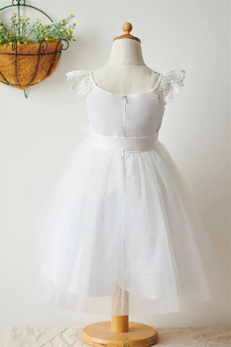 Elegant ivory tulle flower girl dress features with boat beck, cap sleeves and belt.