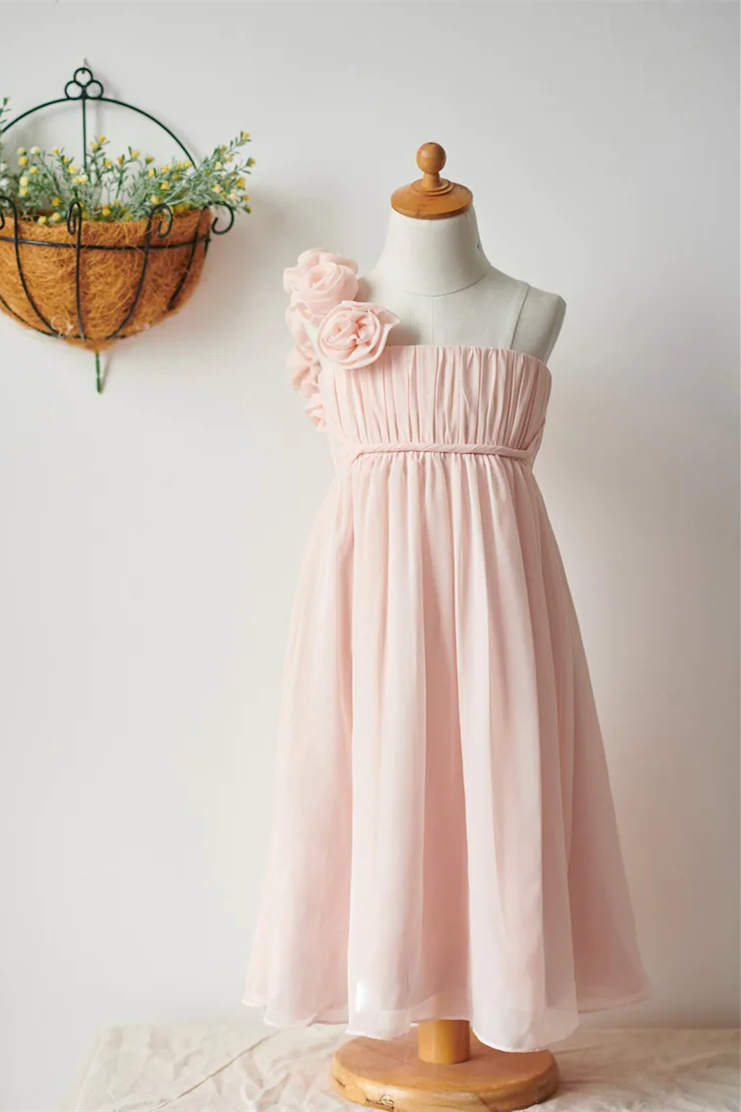 One-Shoulder Blush Pink Chiffon Flower Girl Dress