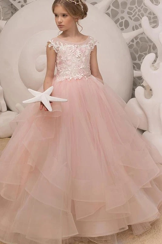 Princess Long Pink Flower Girl Dress with Lace Appliques