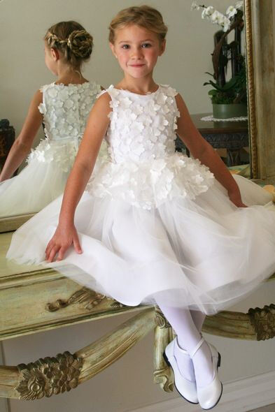 Princess a-line long white flower girl dress features appliques and zipper back.