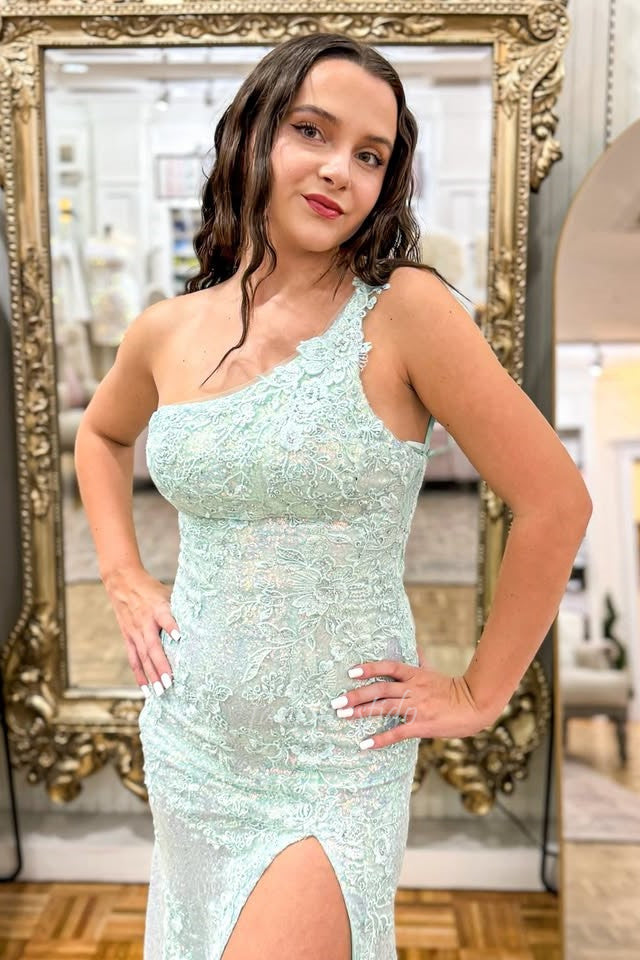 Elegant One Shoulder Mint Green Lace Prom Dress with Slit