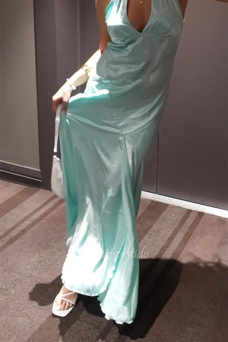 Chic Aqua Satin Halter Neck Maxi Prom Dress with Backless