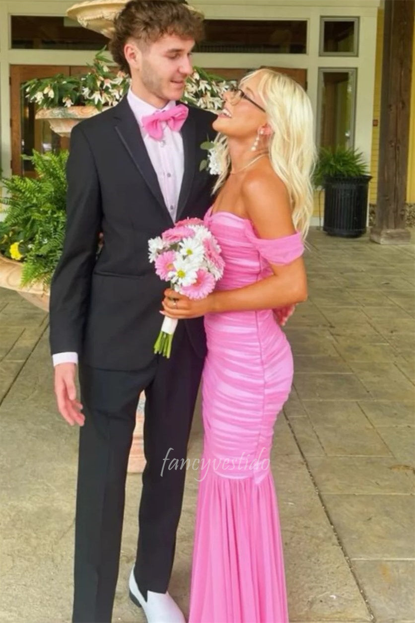 This off-the-shoulder mermaid prom dress features a sweetheart neckline and ruched detailing to accentuate the figure with refined elegance. Its tailored silhouette hugs the body through the bodice and hips before flaring at the hem, creating a dramatic and flattering shape. Designed for a sophisticated appearance, this gown balances classic romantic elements with modern craftsmanship, making it an exceptional choice for memorable formal occasions.