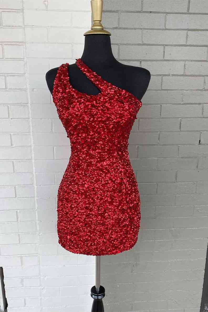This tight blue short homecoming dress features one shoulder, blue sequins and open back.