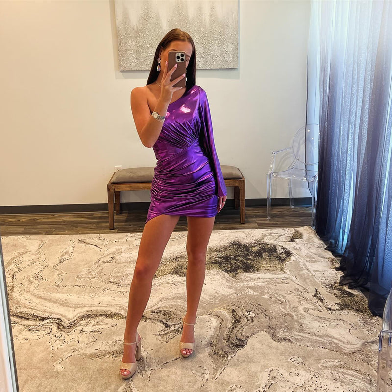 Metallic Purple One Shoulder Mini Dress with Puff Sleeve