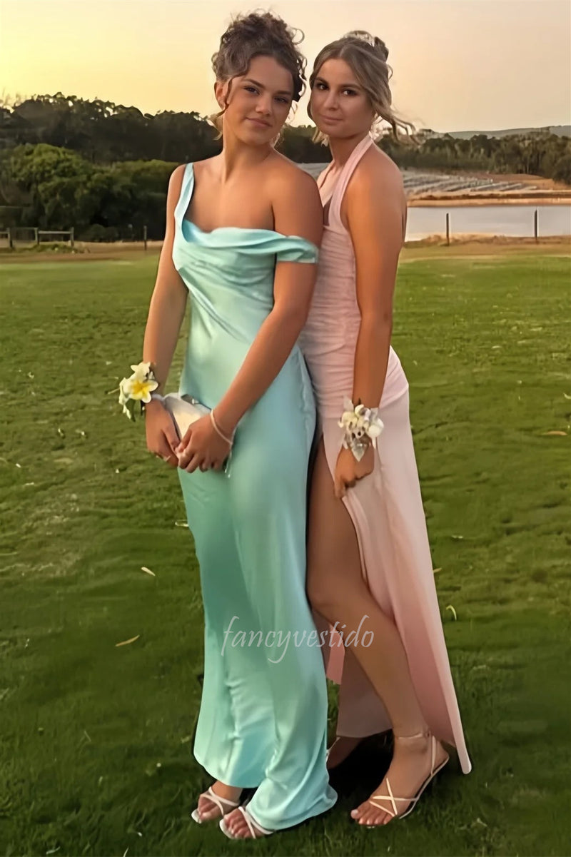 Halter Asymmetrical Pink Pleated Satin Long Bridesmaid Dress