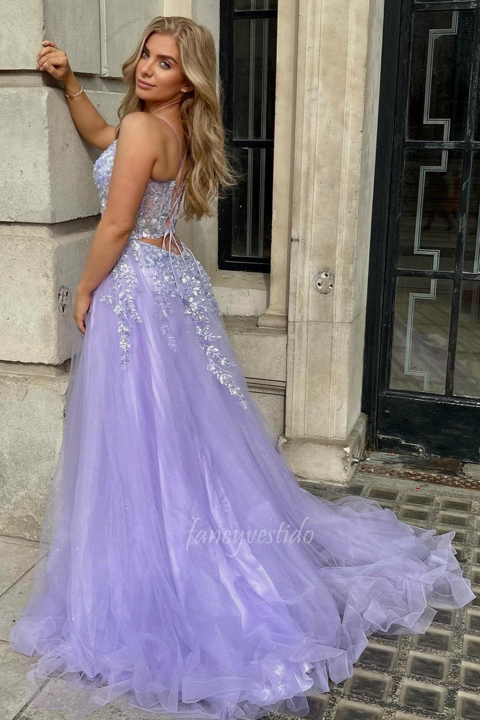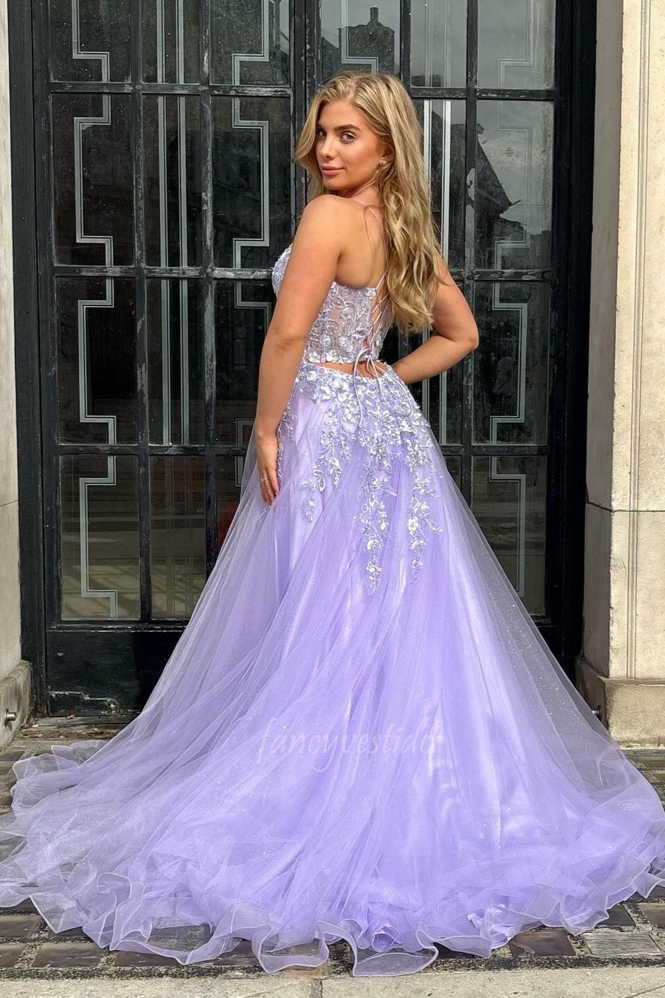 Elegant Lavender Lace Applique Corset Tulle Prom Dress