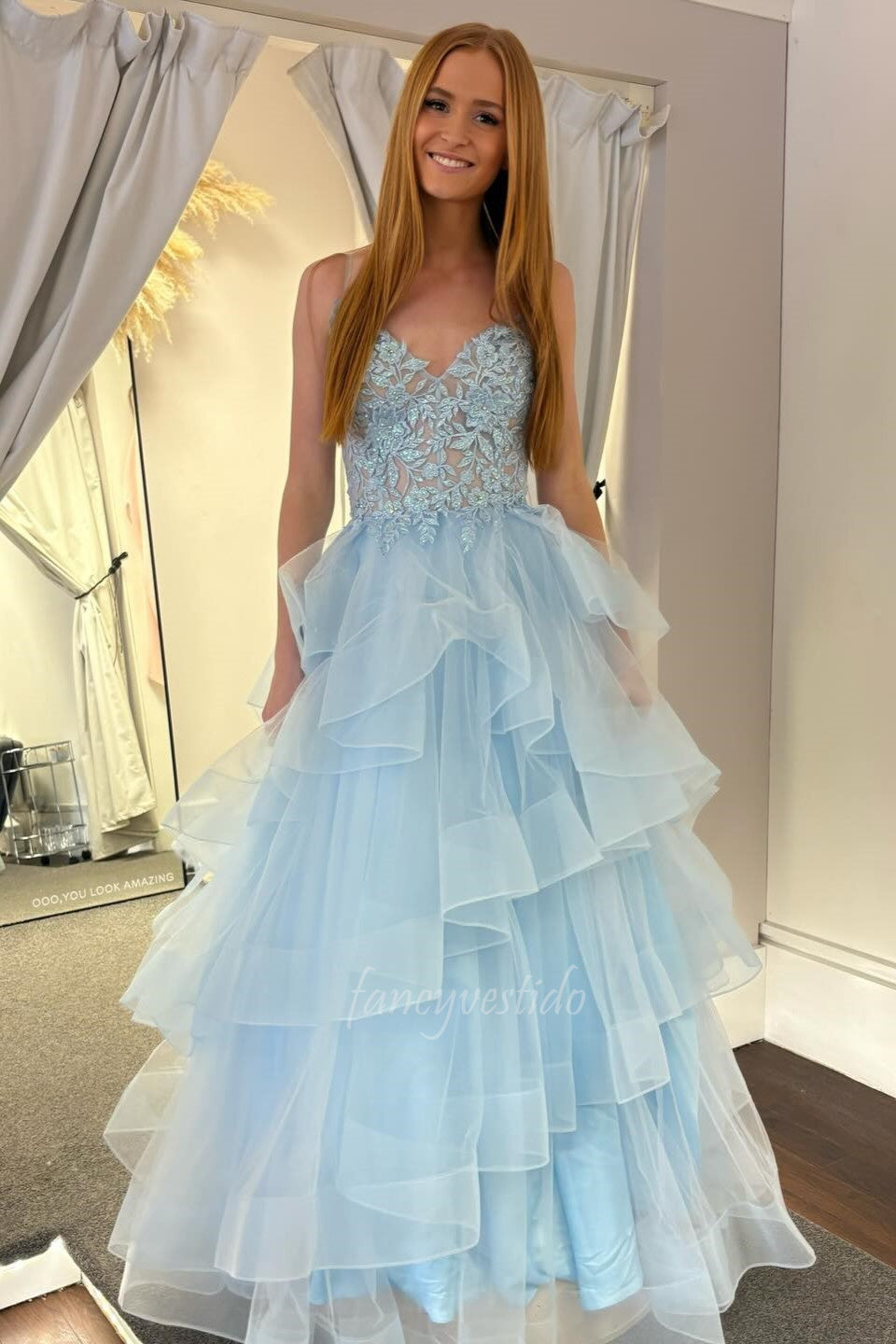 Elegant Straps Sky Blue Lace Applique Tiered A-Line Prom Dress