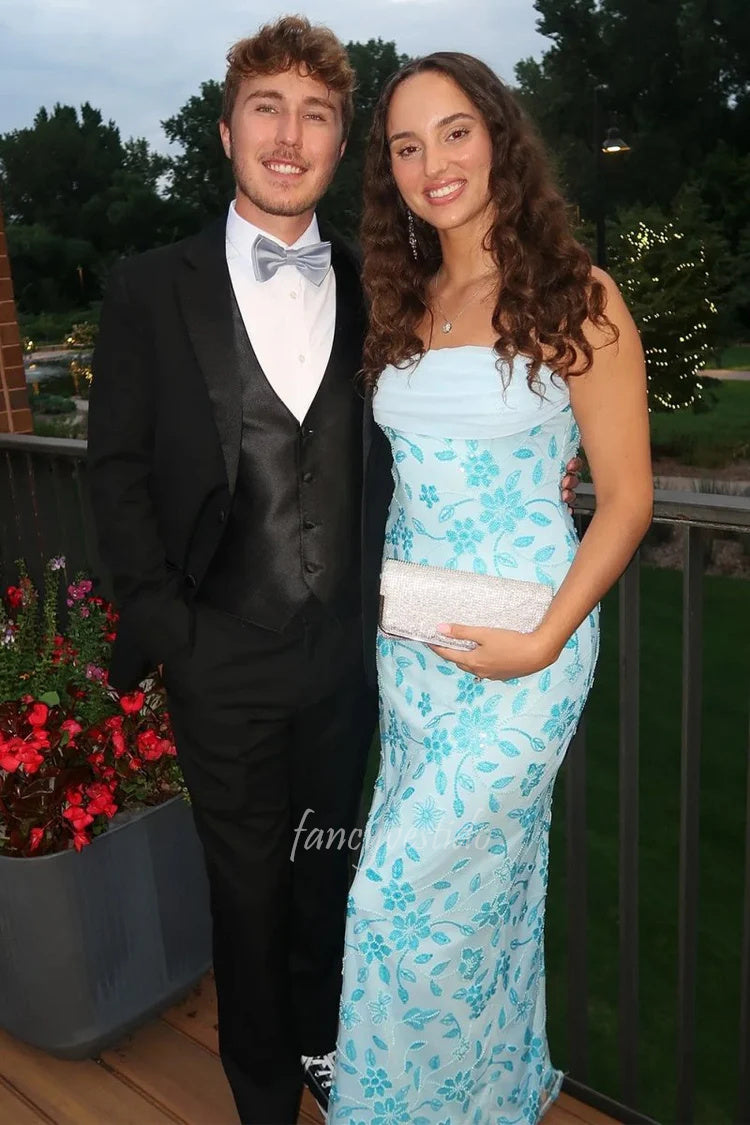 Glitter Strapless Blue Beaded Applique Fitted Maxi Dress