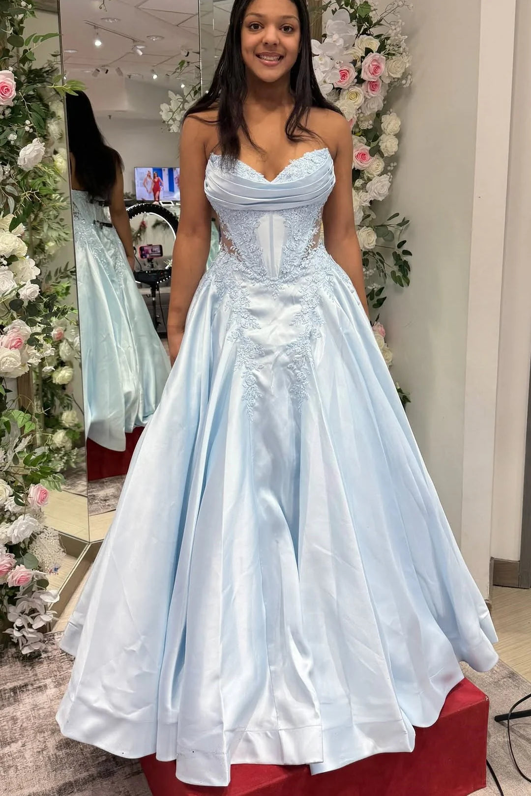 Light Blue Satin A-Line Lace Appliques Maxi Party Prom Dress