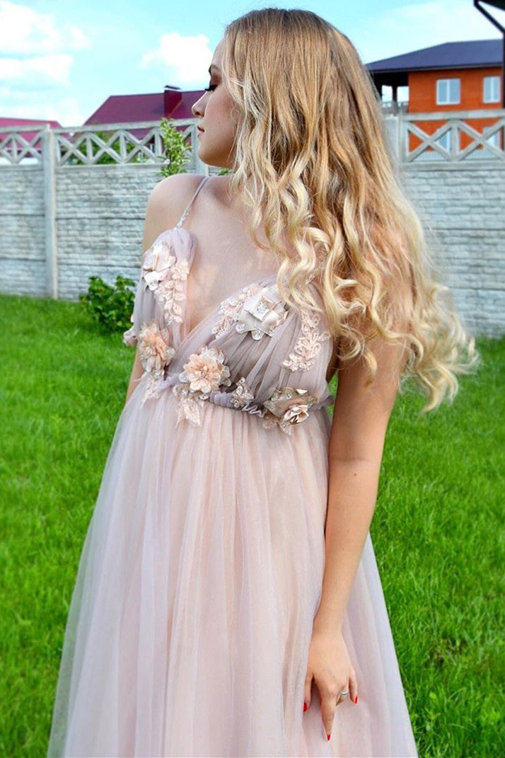 Romantic a-line blackless long pink formal dresses with v neck, spaghetti straps and handmade flowers.