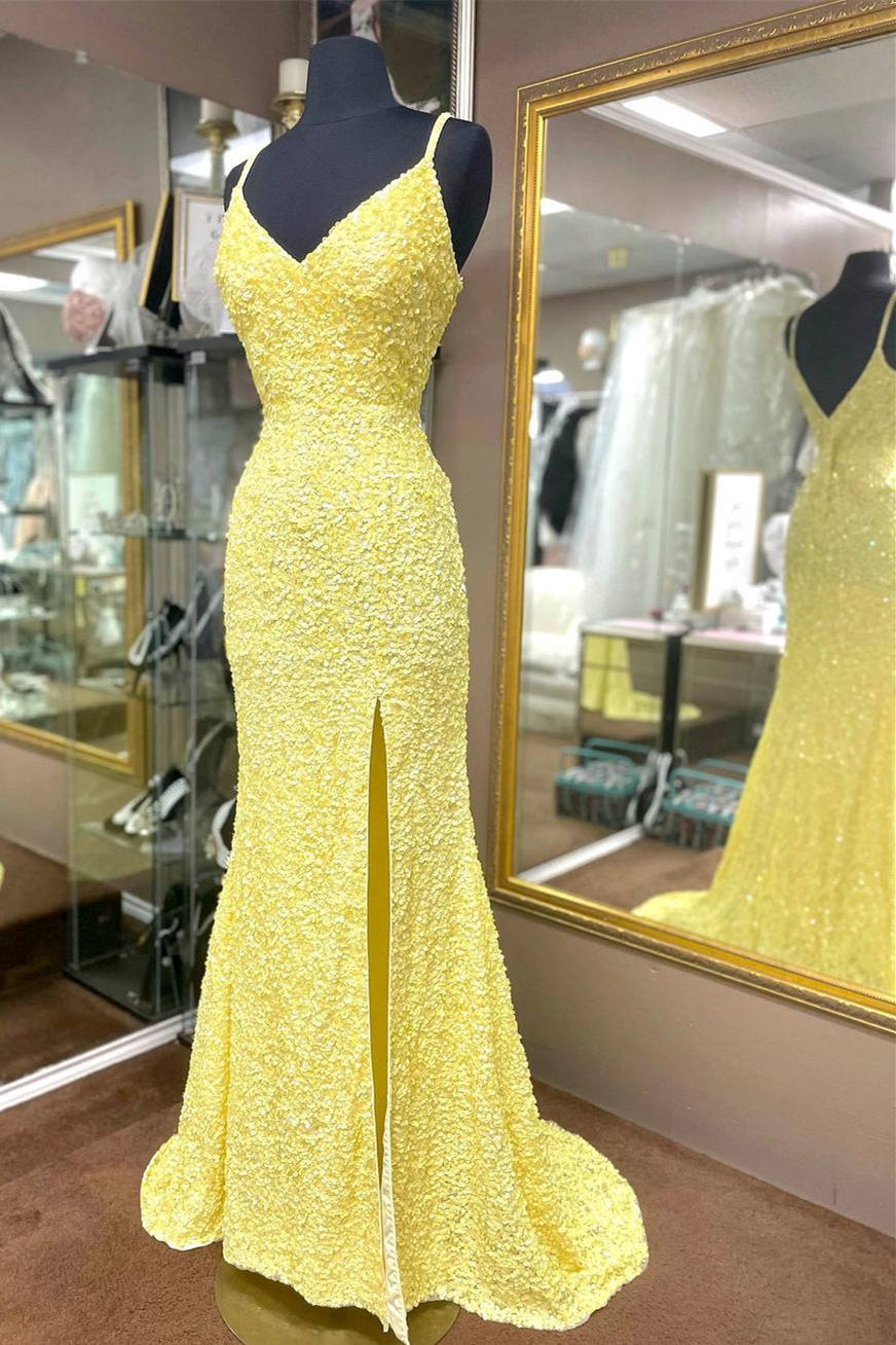 Elegant yellow long prom dress features spaghetti straps and high slit. Inexpensive but Good Quality.
