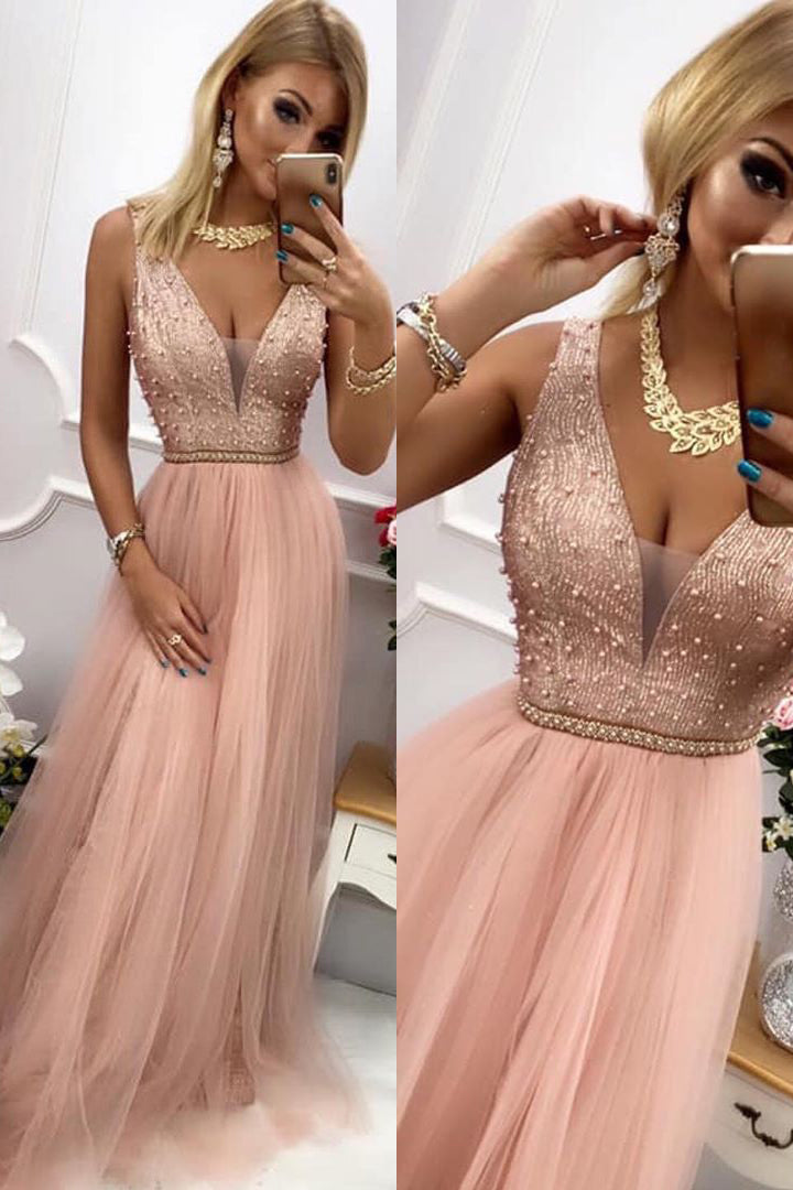 Gorgeous V Neck A-Line Beaded Blush Pink Long Prom Dress