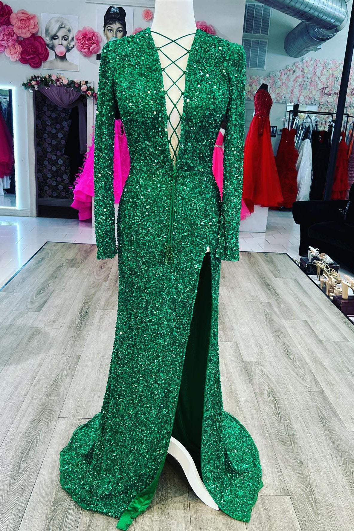 Fancyvestido this prom dress features a plunging V neckline with lace-up detail, long sleeves, and full sequins corset bodice with a thigh-high leg slit.