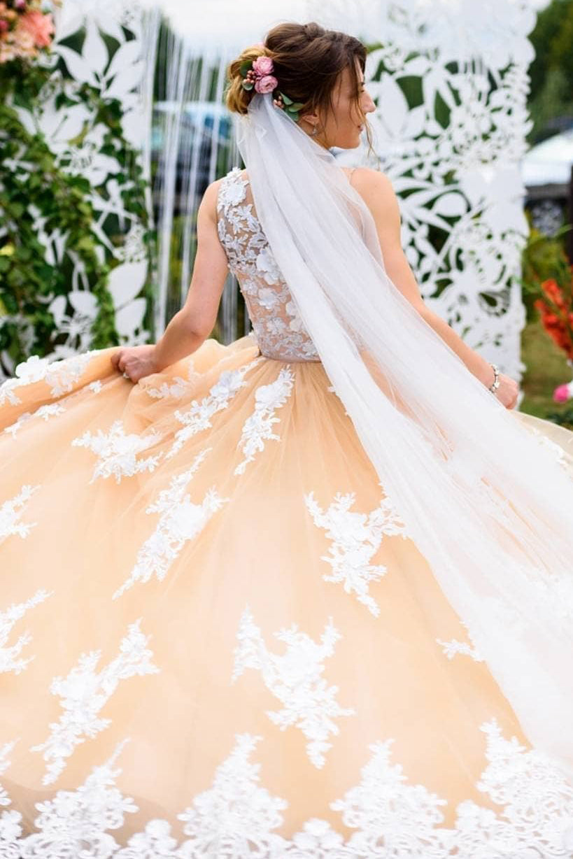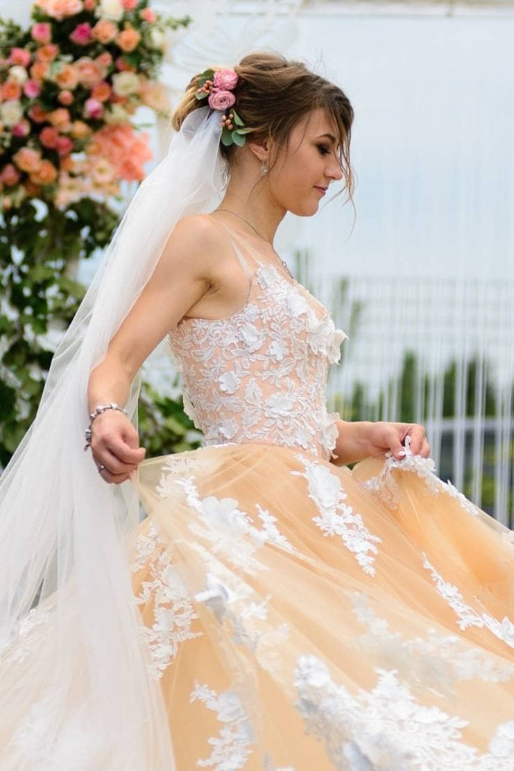 This princess a-line peach long prom dress features spaghetti straps and white lace appliques. Good Quality.