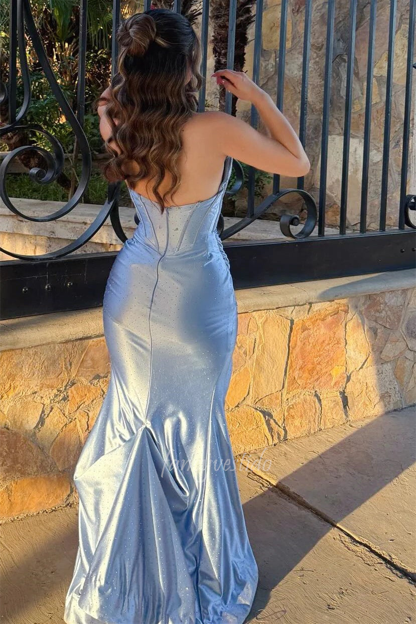 Strapless Beaded Boned Pleated Slit Mermaid Prom Dress