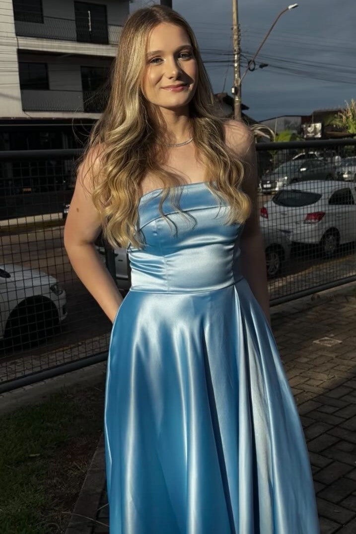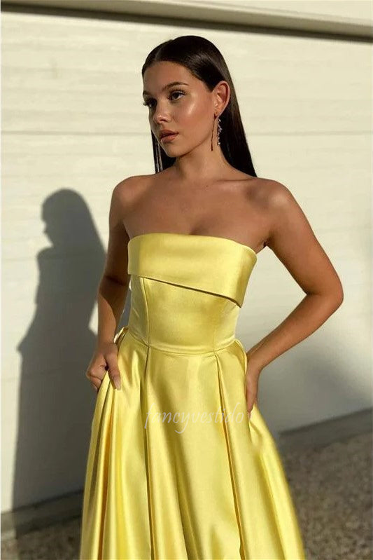 Make a luminous statement in this yellow strapless A-line satin prom dress, a bold choice for confident formal wear. The clean strapless neckline emphasizes the shoulders and collarbone with elegant simplicity, while premium satin fabric provides a sophisticated sheen and graceful movement. The A-line silhouette flatters all body types by skimming the waist and hips before flowing gently to the floor, creating a universally flattering proportion. A high slit adds contemporary edge and practical ease of movement without sacrificing refinement. This dress combines vibrant color with expert tailoring and quality materials, delivering a striking look that balances modern sensibility with timeless formal elegance.