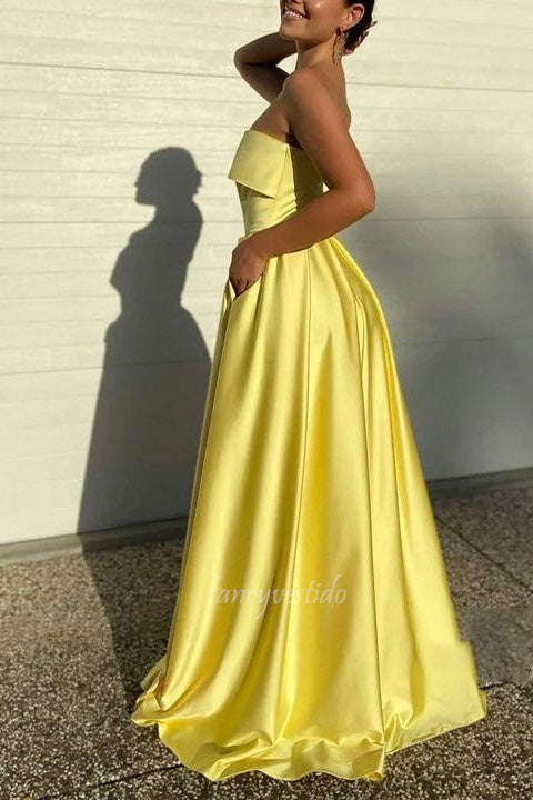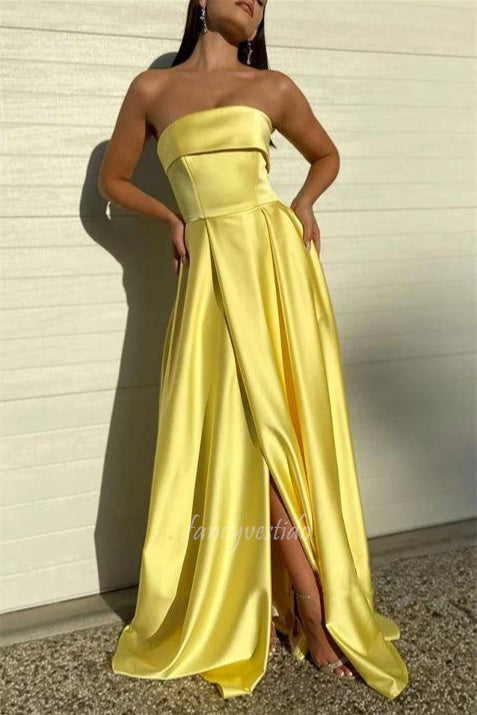 Yellow Strapless A-line High Slit Satin Prom Dress