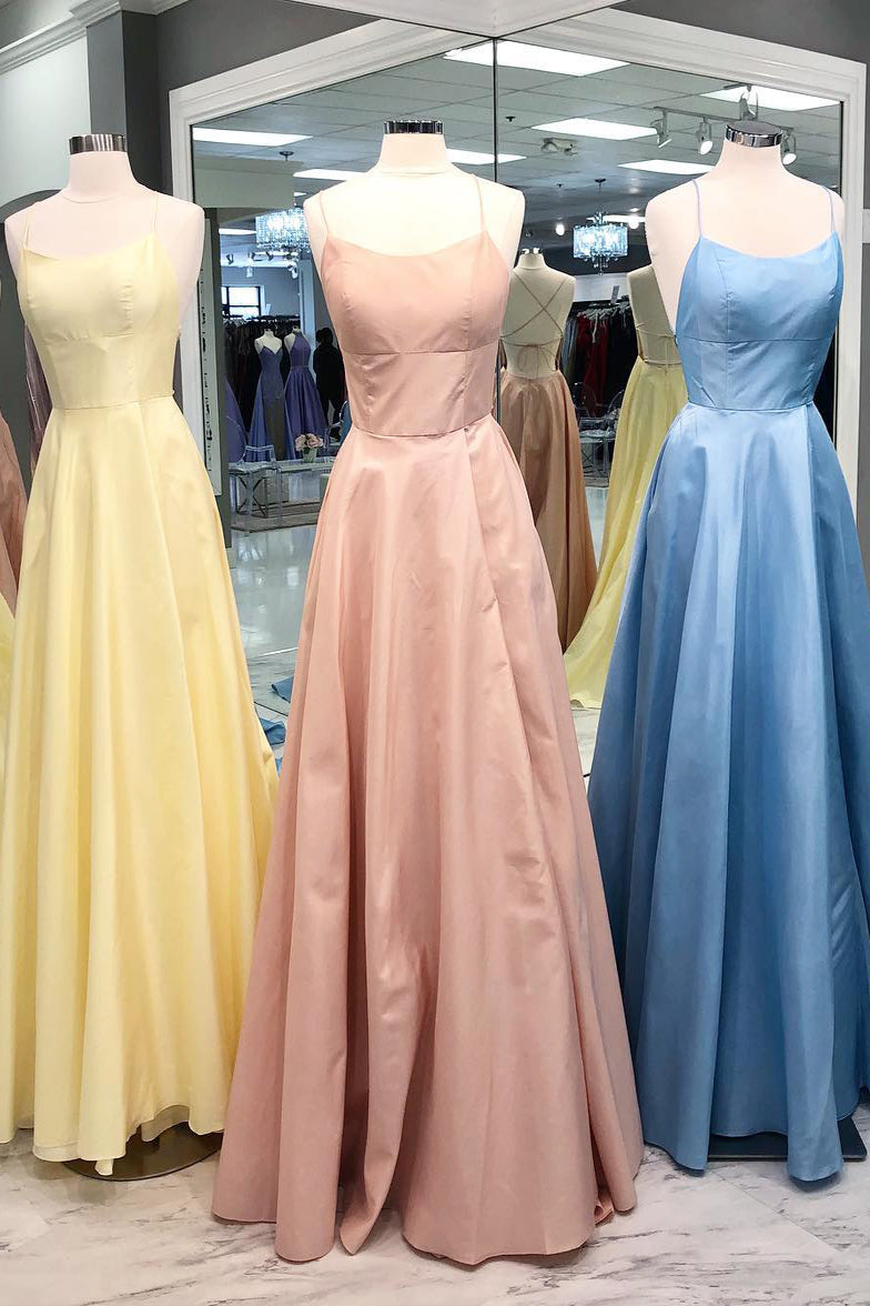 Spaghetti Straps A-Line Long Daffodil Prom dress with Criss Back