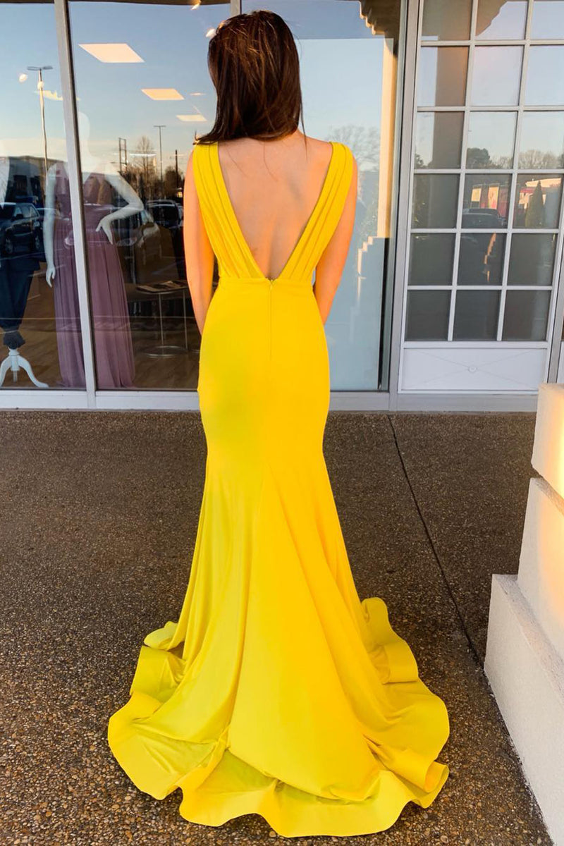 Mermaid V-Back Ruched Long Yellow Prom Dress
