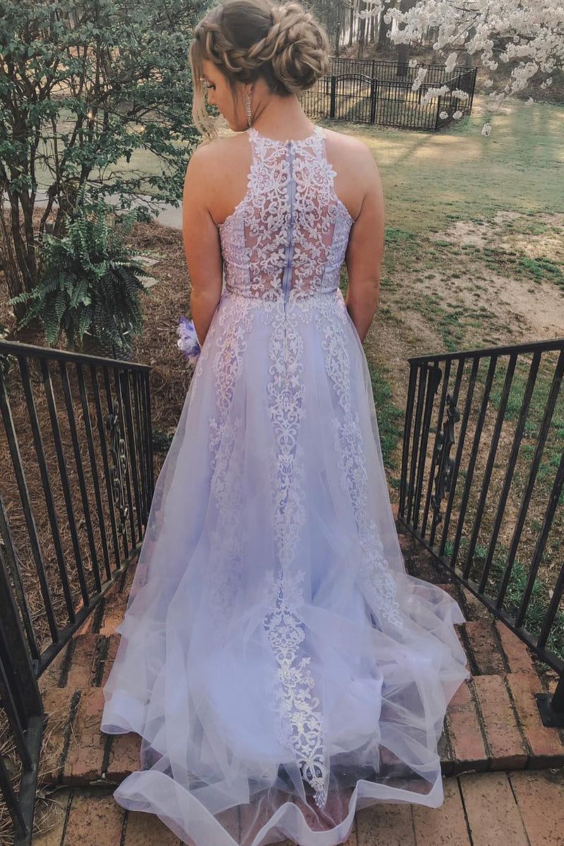 Jewel Neck Appliques Lavender Prom Dress with Train