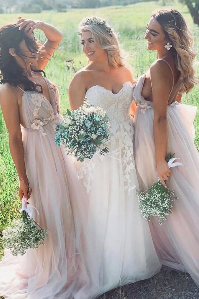 Long Romantic Spaghetti Strap V-Neck Pink Formal Dress with Handmade Flowers