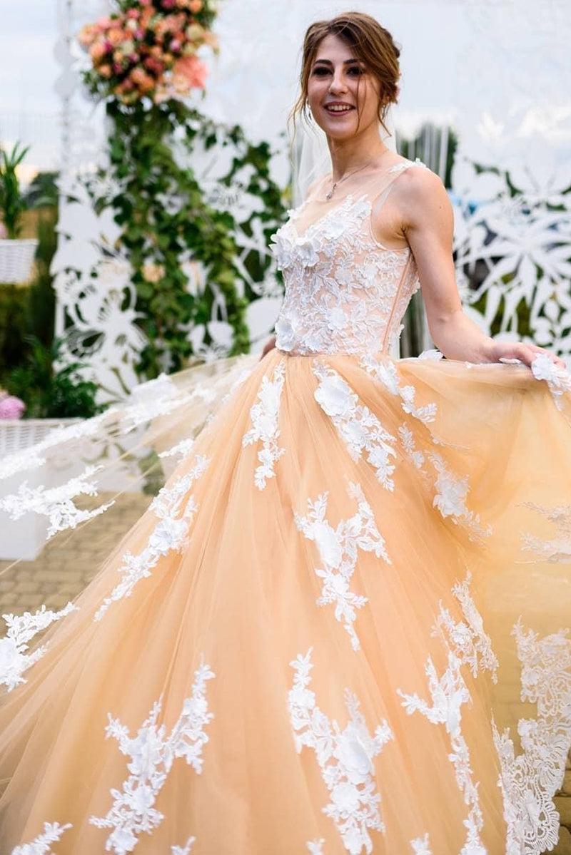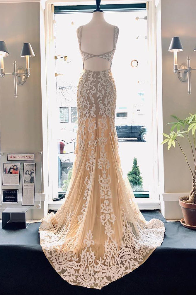 Elegant Champagne Long Prom Dress with Lace Appliques
