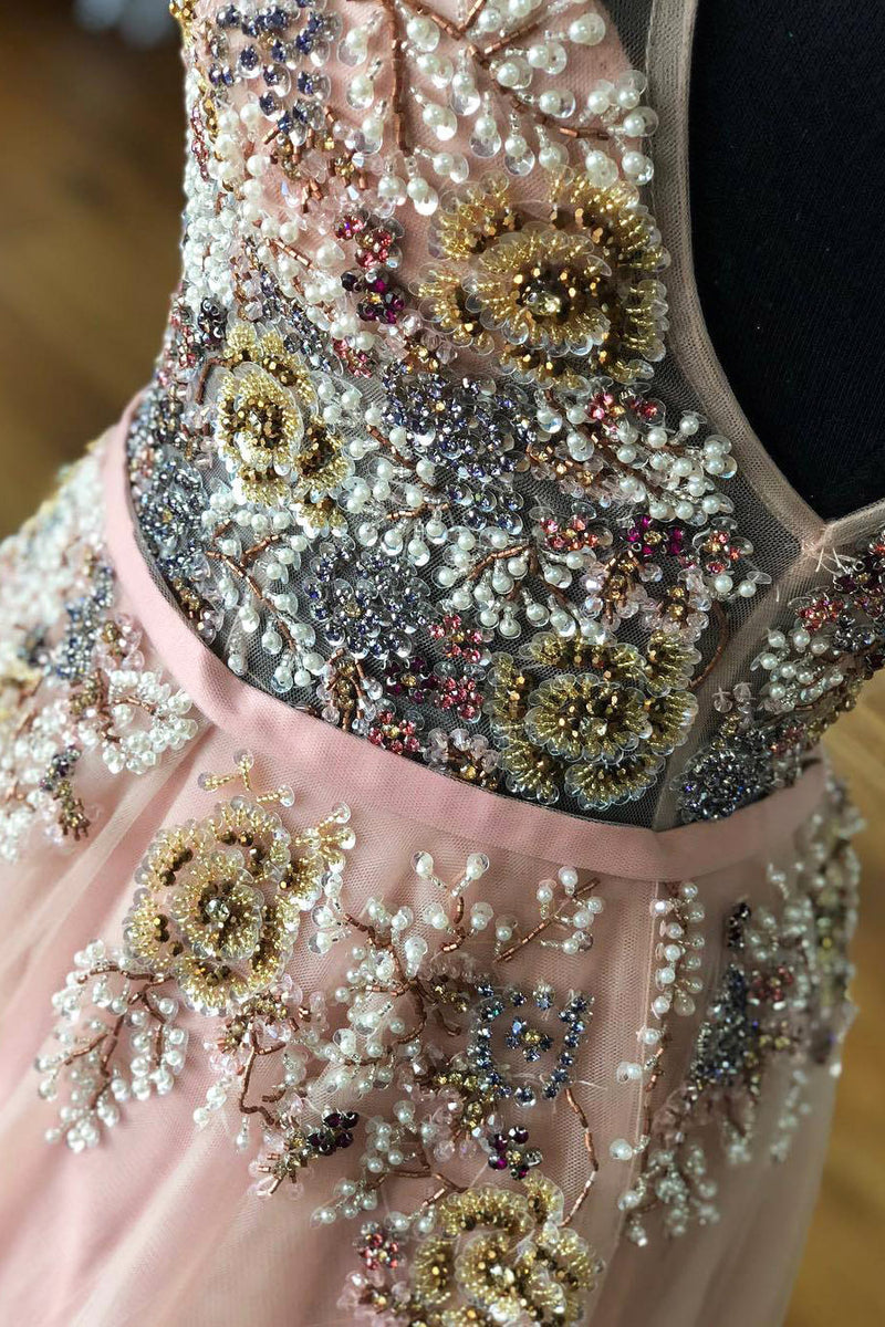 Pearl Pink Tulle Long Prom Dress with Beading Flowers