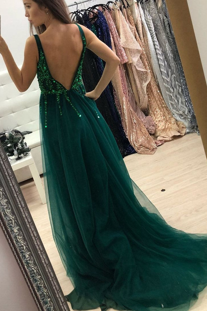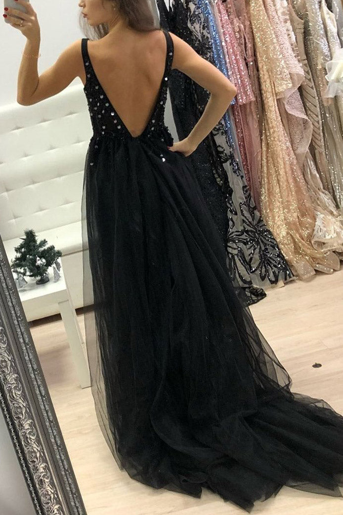 Luxurious V Neck Black Tulle Formal Evening Dress