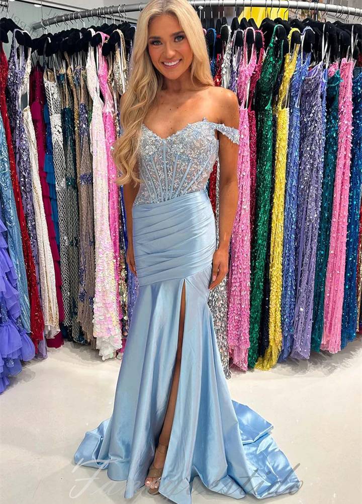 Off-Shoulder Baby Blue Applique Mermaidl Prom Dress with Slit