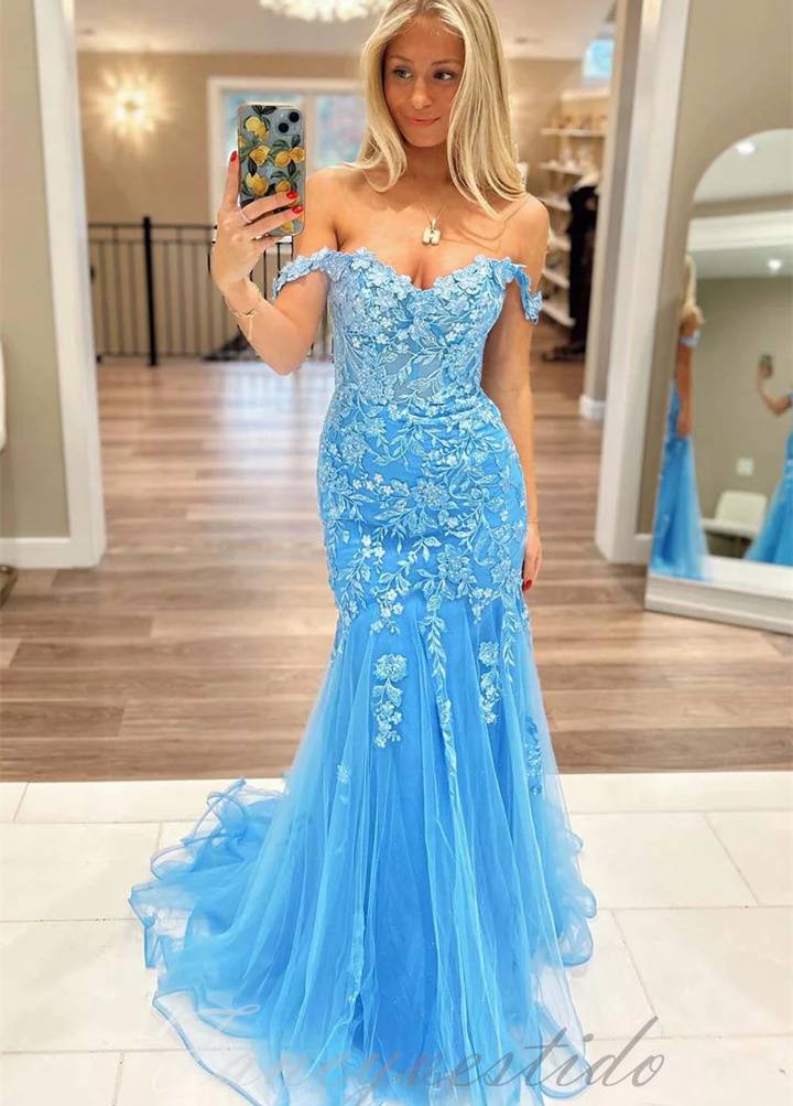 Blue Applique Mermaid Tulle Prom Dress with Off-Shoulder