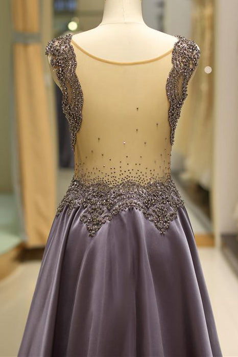 Scoop Champagne Beaded Floor Length Prom Gowns