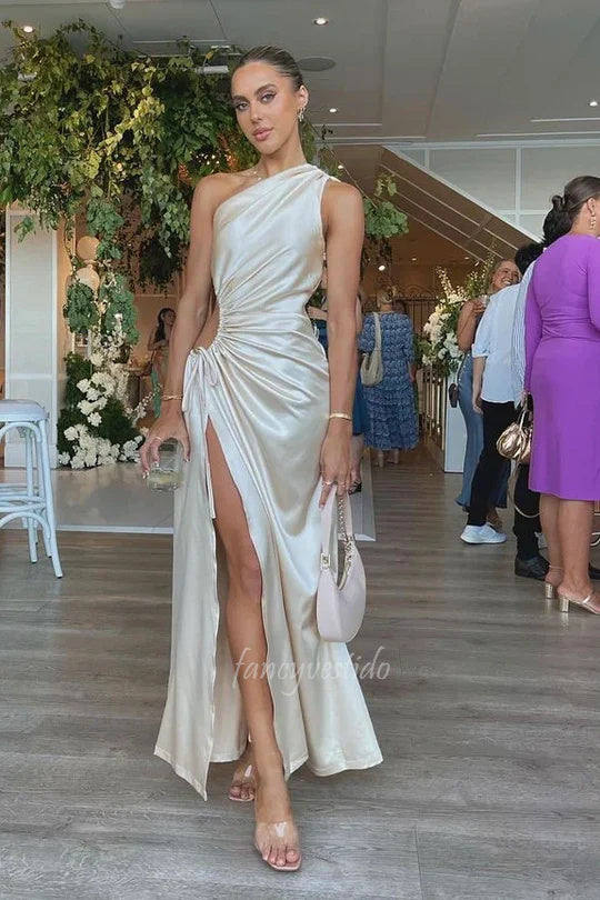 One Shoulder Cutout Pleated Mermaid Slit Formal Prom Dress