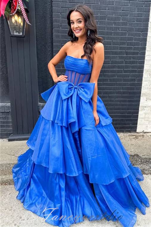 Light Blue Corset Lace Tiered Tulle Long Formal Dress