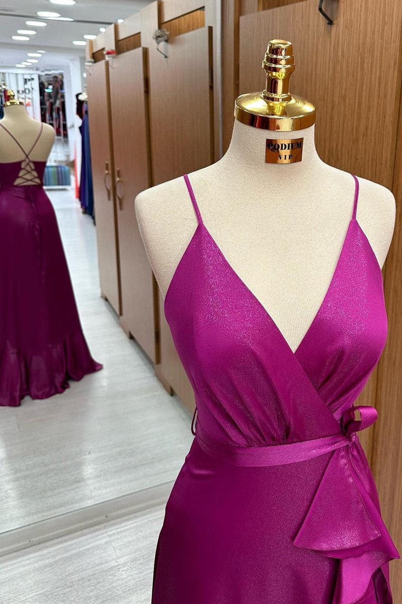 V-Neck Straps Fuchsia Hi-Low Bridesmaid Dress with Belt
