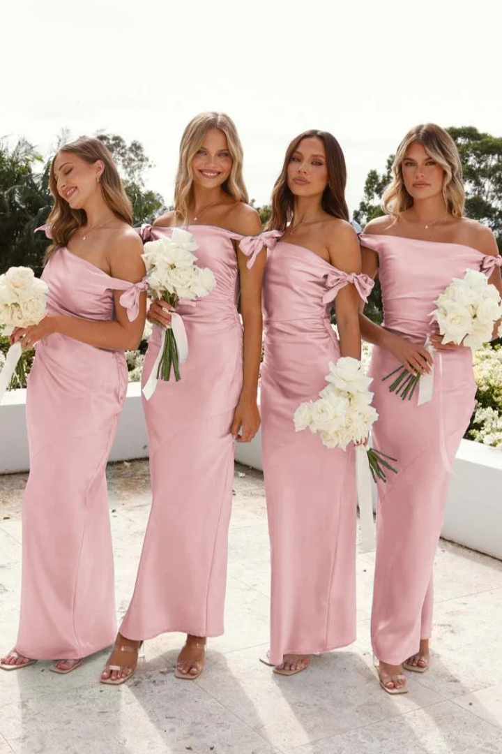 This sophisticated bridesmaid dress delivers contemporary elegance with timeless appeal. The off-shoulder bow detail creates a romantic focal point while maintaining refined restraint, and the sky blue shade provides a fresh, universally flattering canvas. Structured pleating along the sheath silhouette adds visual interest and subtle texture, while the floor-length cut conveys formal polish. The streamlined design ensures your bridesmaids move with ease and confidence, making this an excellent choice for weddings that demand both style and practicality.