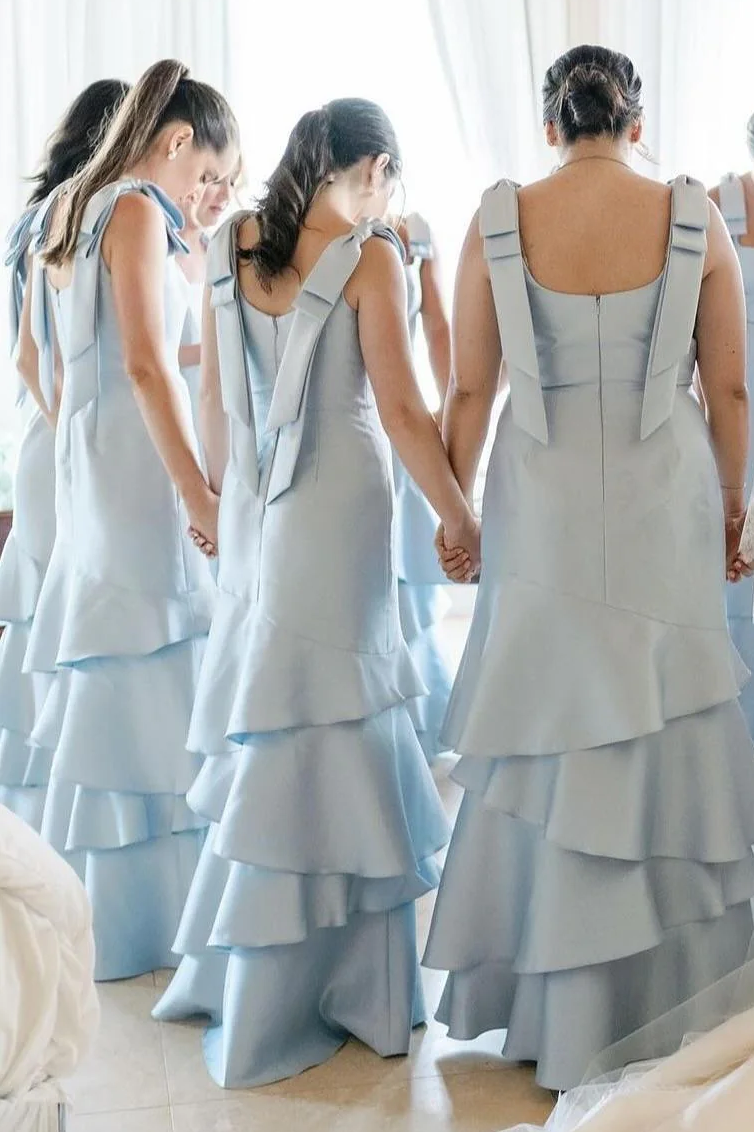 Bow Straps Light Blue Ruffle Layered A-line Bridesmaid Dress