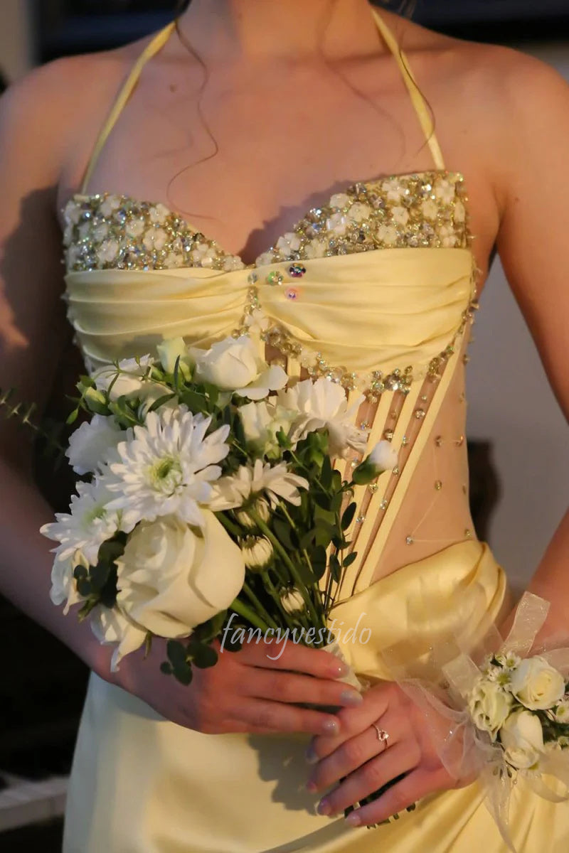 Elegant Yellow Halter Corset Boned Prom Dress with Beaded